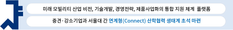 급변하는 모빌리티 산업 환경에 대응하기 위해 소재부품장비 중견강소기업 대상으로, 미래 모빌리티 산업 비전, 기술개발, 경영전략, 제품사업화 등의 다양한 분야에 대한 지원 체계를 제공하고, 중견강소기업-서울대 간 연계형 연구개발을 촉진하는 통합 지원 프로그램